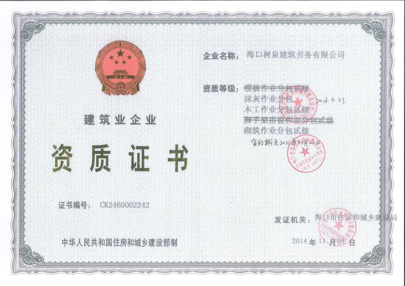 海口樹泉建筑勞務(wù)有限公司成立于2011年,公司位于海口,其前身是一家專業(yè)建筑施工隊,自2004年即開始在海南從事建筑勞務(wù)施工。自成立至今,公司已經(jīng)擁有一支科學(xué)管理、質(zhì)量過硬、能打硬仗,搶工期的專業(yè)隊伍。能獨立承擔大中型工業(yè)與民用建筑 、室內(nèi)外裝修、各類機電設(shè)備安裝工程。代表工程有海口濱海華庭、三亞時代海岸T01/02/04/05棟高層、合肥東海花園二期、陵水富力灣B區(qū)高層、三亞金中海(酒店)、瓊海大印經(jīng)典花園、海口環(huán)球海景大酒店(四星級酒店,在建中)、陵水珍珠大廈(五星酒店)、海口萬達廣場、美蘭機場二期。